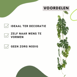 Deze set bevat 3st. Monstera kunstslinger 120cmCreëer met deze 3 kunstslingers een ware jungle vibe in jouw ruimte. Voordelen van een Monstera Kunstslinger ✅ Onze kunstplanten gaan nooit dood✅ Onze kunstplanten zijn hypoallergeen✅ Onze kunstplanten vorm je eenvoudig naar wens✅ Onze kunstplanten blijven altijd de gewenste afmeting✅ Onze kunstplanten hebben geen verzorging nodig en kunnen overal staan Afmetingen Monstera Kunstslinger 120cm Hoogte kunstplant: 120cmDiameter kunstplant: 20cm Let op: Bevat geen pot