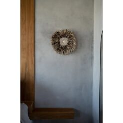 Onze prachtige grijsbruine wanddisplay met veren is een echte bohemien schoonheid om elke muur in je interieur, overdekt terras of tuin te versieren. De middencirkel is omgeven door met de hand geplaatste schelpen.