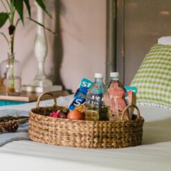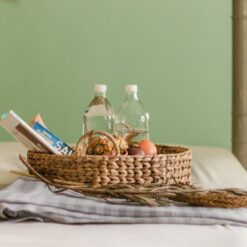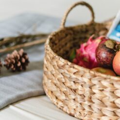 De waterhyacint is een tropische waterplant die groeit op rivieren en meren. Het komt eigenlijk uit Zuid-Amerika, maar werd ook geïntroduceerd in Zuidoost-Azië. Daar wordt het als een onkruid beschouwd omdat het zich ongelooflijk snel vermenigvuldigt en hele watermassa’s kan bedekken met een tapijt van bladeren. Het daaruit voortvloeiende gebrek aan licht en zuurstof zorgt ervoor dat al het leven onder water afsterft. Daarom moeten de planten regelmatig worden verwijderd. Om de planten klaar te maken voor verdere verwerking worden de bladeren afgesneden en worden de dikke stengels drie tot zeven dagen in de zon gedroogd. Het resultaat is een duurzame grondstof die hier bij Soeji voor veel geweven goederen in overvloed beschikbaar is!