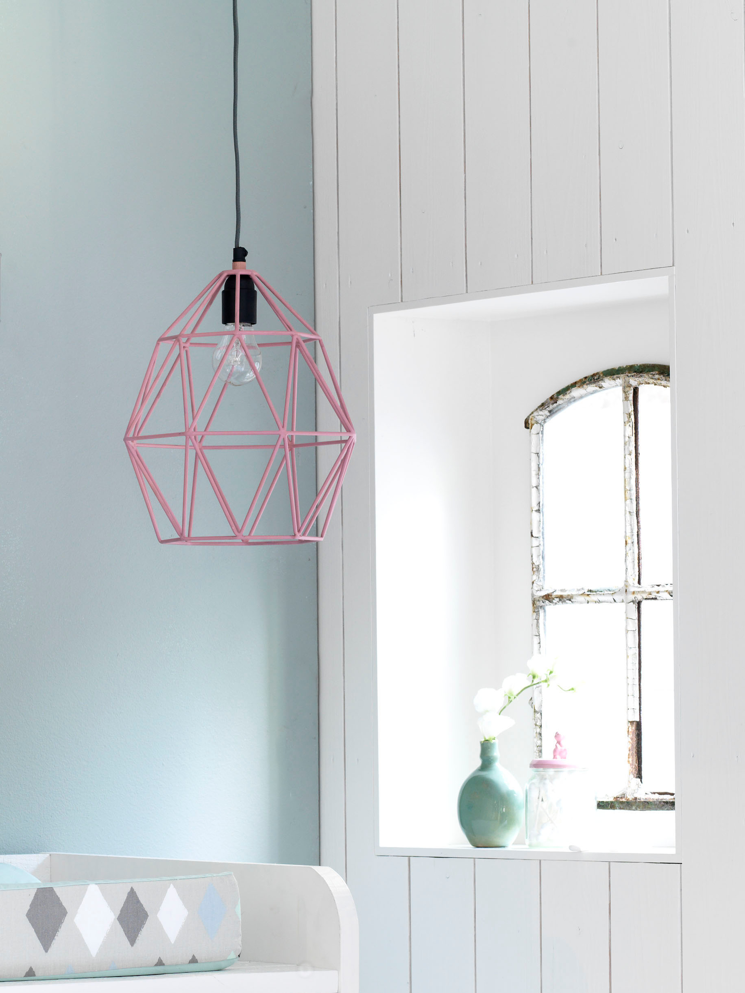 Deze draadlamp in zachtroze is een lieve blikvanger voor de kinderkamer: speels van vorm maar rustig en basic van stijl, zodat hij mee kan groeien met het interieur. Het open metalen frame geeft een lichte, luchtige uitstraling en laat het licht mooi verspreiden.