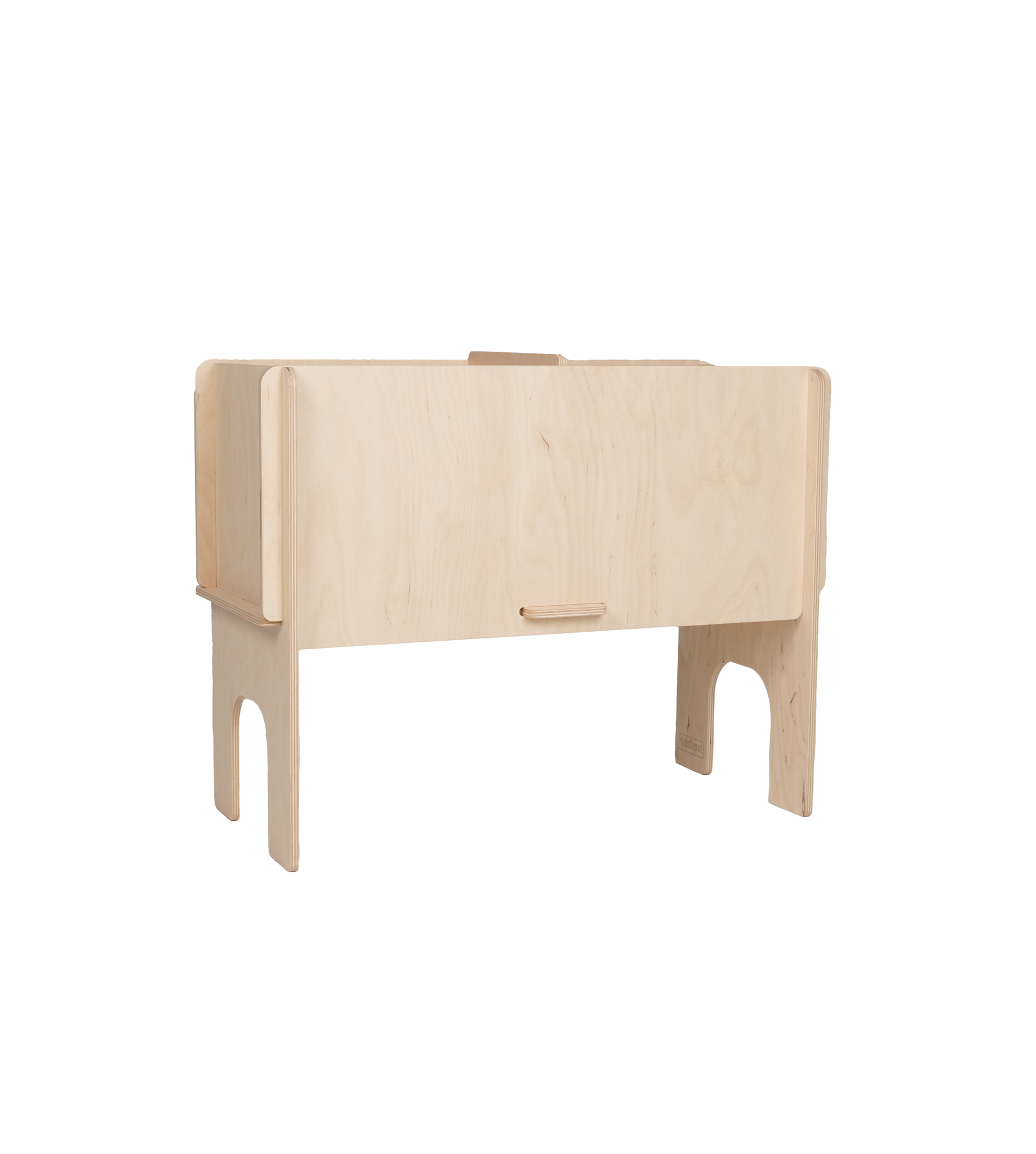 We gebruiken duurzame materialen en eenvoudige afwerkingen zodat de kist lang meegaat en later makkelijker te recyclen is. Het compacte, stabiele model heeft afgeronde hoeken voor veilig gebruik in huis. Onderhoud is simpel: afnemen met een vochtige doek.
