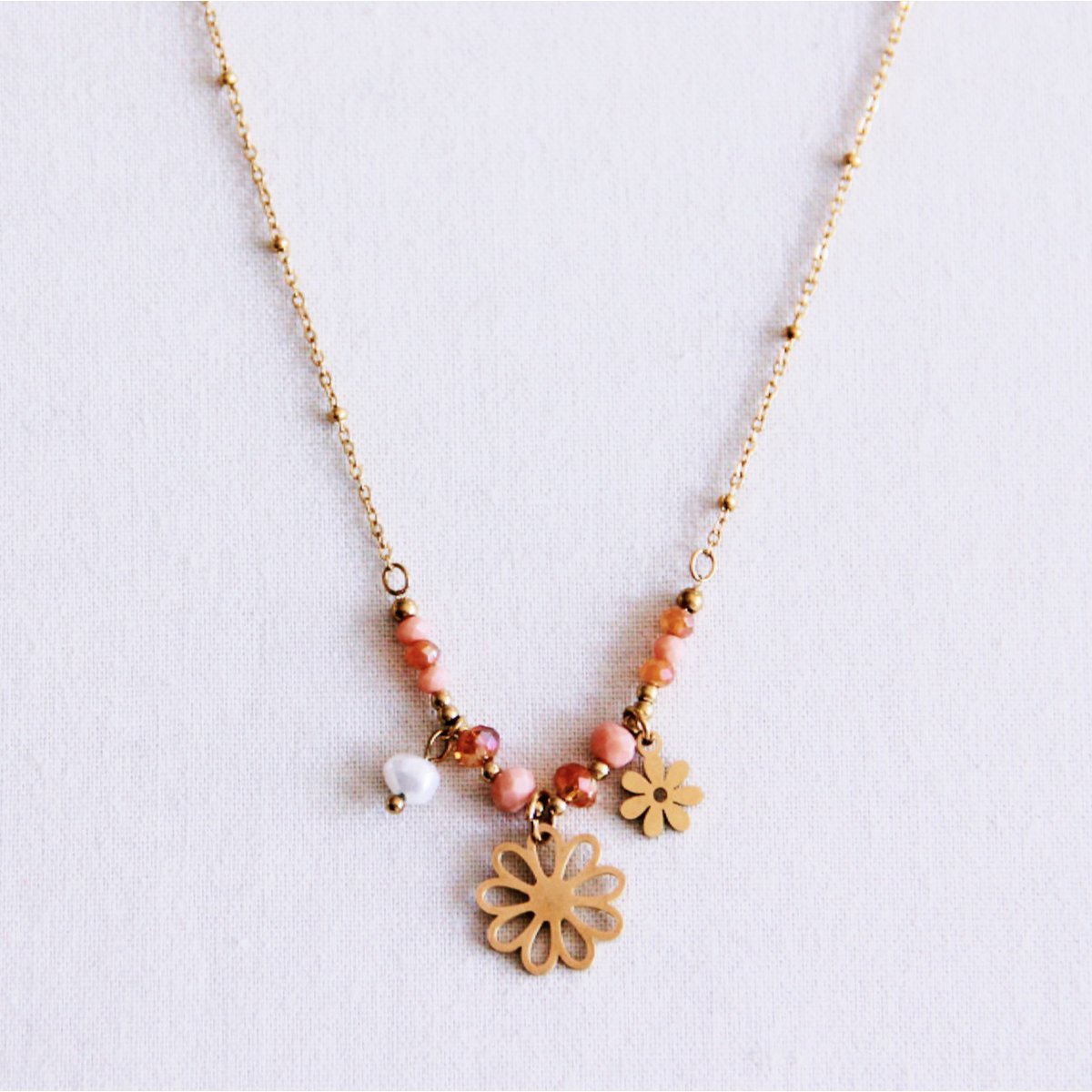 Fijne ketting met facetten, parel en bloemencharme – naakt