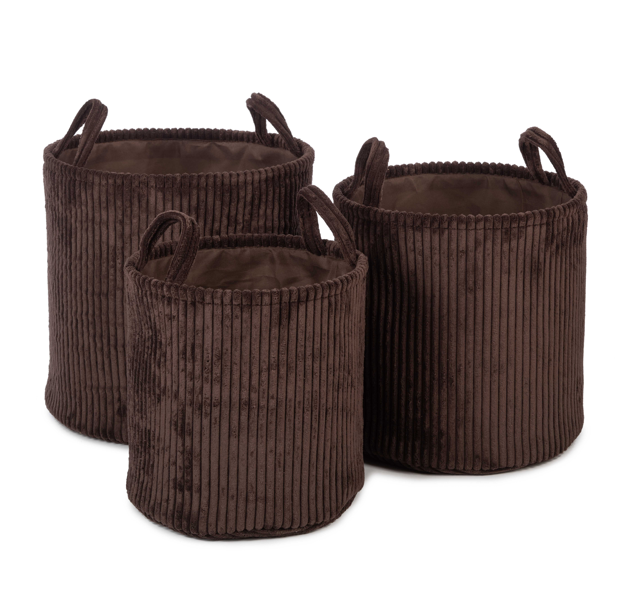 Ebby: set van 3 ribstof-opbergmanden in warme chocoladebruin. Stijlvol en praktisch — houdt speelgoed, kleding en accessoires overzichtelijk; past moeiteloos in elk interieur.