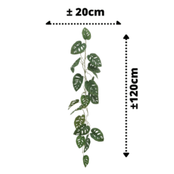 Voordelen van een Monstera Monkey Bush Guirlande ✅ Onze kunstplanten gaan nooit dood✅ Onze kunstplanten zijn hypoallergeen✅ Onze kunstplanten vorm je eenvoudig naar wens✅ Onze kunstplanten blijven altijd de gewenste afmeting✅ Onze kunstplanten hebben geen verzorging nodig en kunnen overal staan Afmetingen Monstera Monkey Bush Kunstslinger 120cm Hoogte kunstplant: 120cmDiameter kunstplant: 20cm Deze Monstera is een prachtige tropische klimplant. De naam ‘gatenplant’ dankt de plant aan de speciale vorm van de bladeren, vol met gaten. Normaal gesproken heeft een Monstera veel zonlicht nodig, maar deze gelukkig niet! Weet jij een mooi plekje voor deze topper? Let op: Bevat geen pot