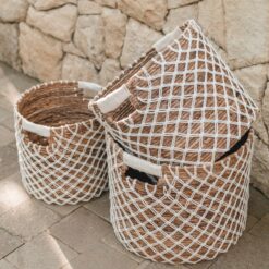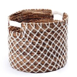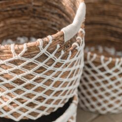 De ronde Pura mand is geheel met de hand gemaakt van bananenvezels. De bijgevoegde witte katoenen koorden zijn kunstig geweven in het traditionele “Kawung” patroon en zijn een echte blikvanger. Zeker in combinatie met een mand met zwarte koorden, zoals ons model Praya, vormt het resultaat een fascinerend contrast.