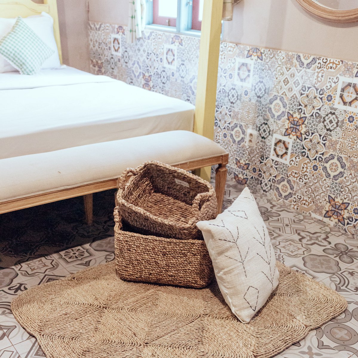 De waterhyacint is een tropische waterplant die op rivieren voorkomt en gezien wordt. Ze zijn eigenlijk afkomstig uit Zuid-Amerika, maar ook uit Zuidoost-Azië. Daar verguldt het als onkruid, omdat het zich ongelooflijk snel vermenigvuldigt en hele watermassa’s met een tapijt kan bedekken. Het juiste gebrek aan licht en contact doodt al het onderwaterleven dat behoort tot de planten die nodig zijn. Om de planten vervolgens te kunnen verwerken voor verdere verwerking, gaan de bladeren verloren en worden de dikke stengels drie tot zeven dagen in de zon gezet. Het resultaat is een overvloed aan mogelijke, toonaangevende grondstoffen voor veel geweven goederen hier bij Soeji!