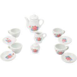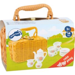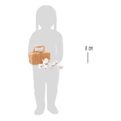 Het porseleinen koffieservies is bedrukt met mooie rozen en is geschikt voor een ontspannen koffiefeestje op het picknickkleed. Gevoerd met rood en wit geruite stof, heeft de geweven plastic hoes een twist-lock manchet om het porseleinen servies veilig te houden tijdens transport. Laat de poppenpicknick beginnen! Welke poppenouders kunnen weerstaan? Een geweldige aanvulling op het rollenspelassortiment