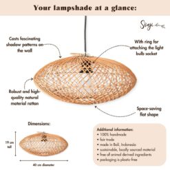 Illumineer je huis met een warme, uitnodigende gloed: de handgemaakte Arana Rattan -lampenkap creëert een boeiend samenspel van licht en schaduw, waarbij ingewikkelde patronen op je muren en plafond worden gegoten. Het natuurlijke, licht-getinte materiaal brengt een luchtige, tropische charme in uw ruimte en bevordert een rustige en ontspannen sfeer. Dankzij de platte, compacte vorm is Arana perfect voor kamers met lage plafonds of gezellige nissen – een stijlvolle upgrade voor uw interieur zonder de noodzaak van grote renovaties.