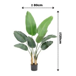 Voordelen van een Strelitzia kunstplant ✅ Onze kunstplanten gaan nooit dood✅ Onze kunstplanten zijn hypoallergeen✅ Onze kunstplanten vorm je eenvoudig naar wens✅ Onze kunstplanten blijven altijd de gewenste afmeting✅ Onze kunstplanten hebben geen verzorging nodig en kunnen overal staan Afmetingen Strelitzia kunstplant 120cm Hoogte kunstplant: 120cmDiameter kunstplant: 80cmHoogte pot: 13cmDiameter pot: 15cmDe Strelitzia eert Charlotte van Mecklenburg-Strelitz, de echtgenote van koning George III van het Verenigd Koninkrijk. Deze Strelitzia kunstplant maakt helaas geen bloemen aan zoals Strelitzia’s in de natuur, maar is qua verzorging een makkelijke dame. Een goede stofbeurt per week en je zal haar niet horen.. ideaal toch! Bloempotje erbij? Deze Strelitzia kunstplant wordt standaard geleverd met een zwarte “kweekpot”. Op zoek naar een mooiere partner voor je Strelitzia?Bekijk dan hier al onze bloempottenToch liever een andere Strelitzia? Die vind je hier
