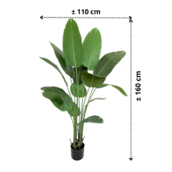 Voordelen van een Strelitzia kunstplant ✅ Onze kunstplanten gaan nooit dood✅ Onze kunstplanten zijn hypoallergeen✅ Onze kunstplanten vorm je eenvoudig naar wens✅ Onze kunstplanten blijven altijd de gewenste afmeting✅ Onze kunstplanten hebben geen verzorging nodig en kunnen overal staan Afmetingen Strelitzia kunstplant 160cm Hoogte kunstplant: 160cmDiameter kunstplant: 110cmHoogte pot: 13cmDiameter pot: 15cm Deze Strelitzia is met haar 1.6 m een flinke verschijning. Normaal gesproken is de Strelitzia gek op zonneschijn, maar deze prachtige kunstplant kan je gerust in plekje in de schaduw geven. Heb jij al een mooie plek in gedachten? Bloempotje erbij? Deze Strelitzia kunstplant wordt standaard geleverd met een zwarte “kweekpot”. Op zoek naar een mooiere partner voor je Strelitzia?Bekijk dan hier al onze bloempottenToch liever een andere Strelitzia? Die vind je hier