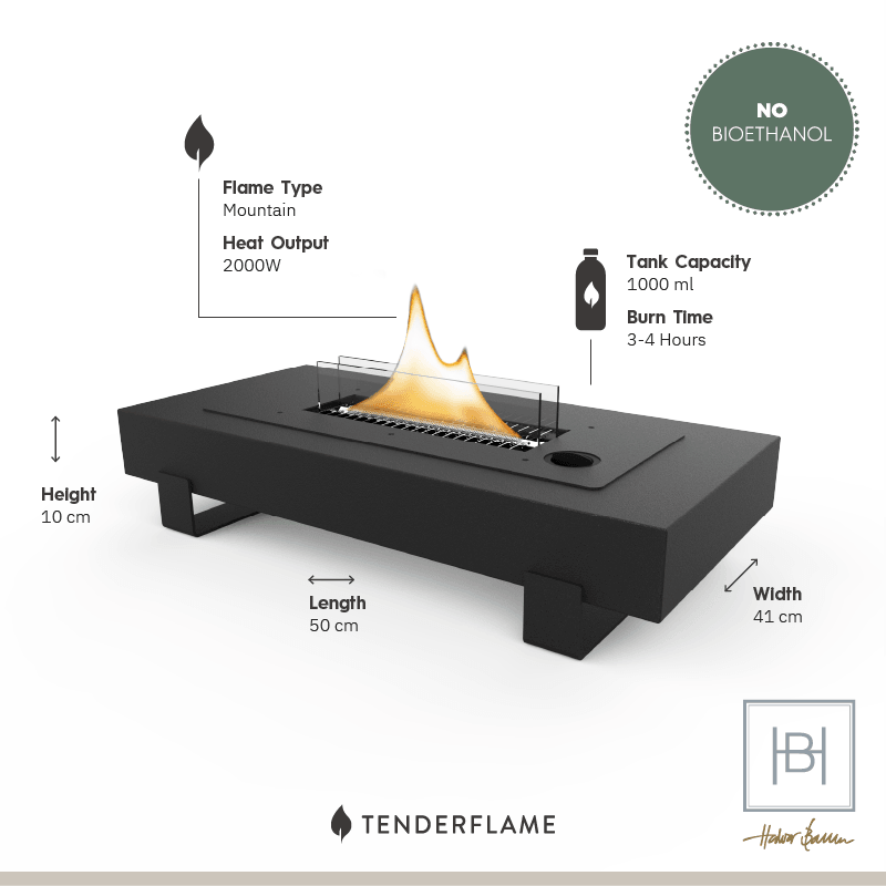 Voor wie bewust kiest: de Table Mountain werkt op Tenderfuel, een schoner en veiliger alternatief voor traditionele bio-ethanol. Je krijgt een comfortabele warmteafgifte van circa 2000 watt zonder rook, zichtbare geur of roet, waardoor de haard geschikt is voor binnen en buiten gebruik en makkelijker schoon te houden is. De brandduur is ongeveer 3–4 uur per tankvulling, ideaal voor korte bijeenkomsten of een ontspannen avond.
