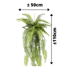 Voordelen van Varen Kunst Hangplant 110cm ✅ Onze kunstplanten gaan nooit dood✅ Onze kunstplanten zijn hypoallergeen✅ Onze kunstplanten vorm je eenvoudig naar wens✅ Onze kunstplanten blijven altijd de gewenste afmeting✅ Onze kunstplanten hebben geen verzorging nodig en kunnen overal staan Afmetingen Varen Kunst Hangplant 110cm Hoogte kunstplant: 110cmDiameter kunstplant: 30cmHoogte pot: 12,5cmDiameter pot: 15cm Op zoek naar een hele mooie varen kunst hangplant? Zoek dan niet verder. Dit is een hele volle kunst hangplant. Perfect om de leegte in een ruimte op te vullen. Met zijn lengte van maar liefst 110cm valt hij in ieder geval op. Heb jij een mooie plek voor deze kunst hangplant in gedachten? Bloempotje erbij? Deze kunst varen wordt standaard geleverd met een zwarte “kweekpot”. Op zoek naar een mooie partner voor je kunstplant? Bekijk dan hier al onze bloempotten